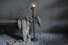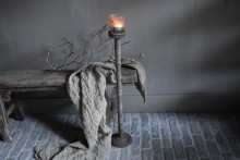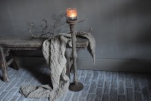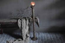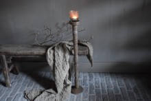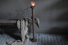 Hoge oude vergrijsde houten vloerkandelaar, er leuk met een windlichtje of stompkaars.Afmeting :  Hoogte 96 cm x Doorsnede van de voet 15 cm...