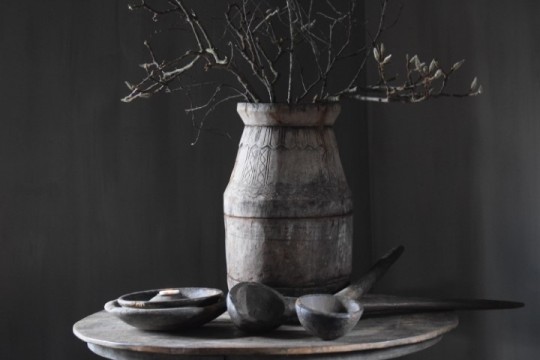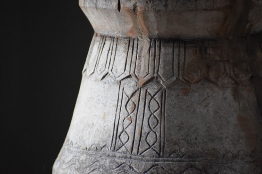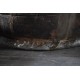 Oude verweerde houten Naga pot met prachtig houtsnijwerk en een ijzeren bodem.