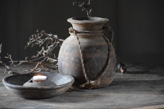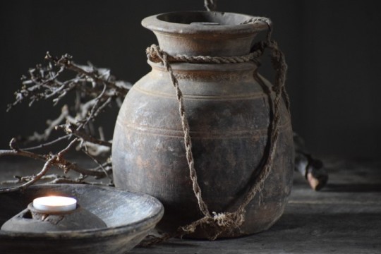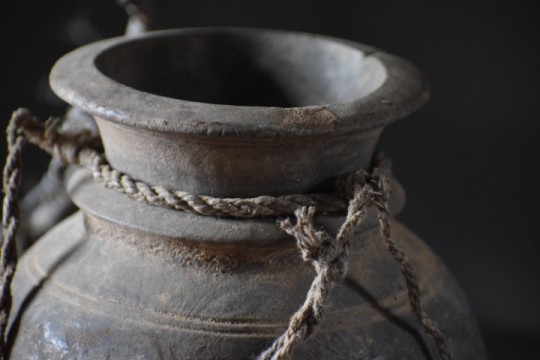 Mooie oude verweerde Nepalese pot met een deksel.