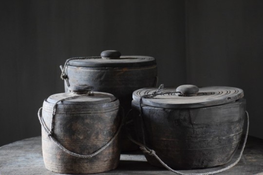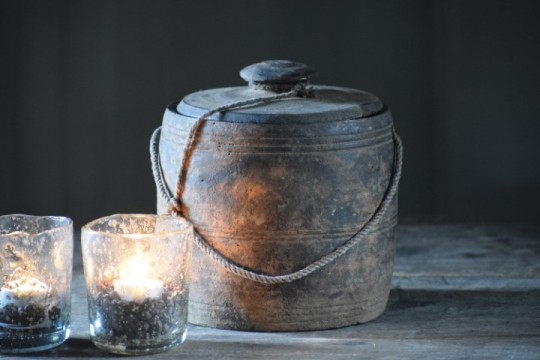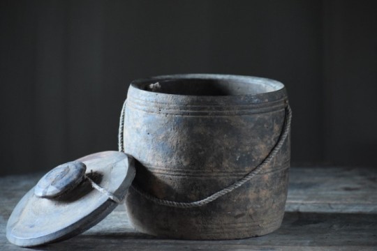 Mooie doorleefde houten pot met deksel.